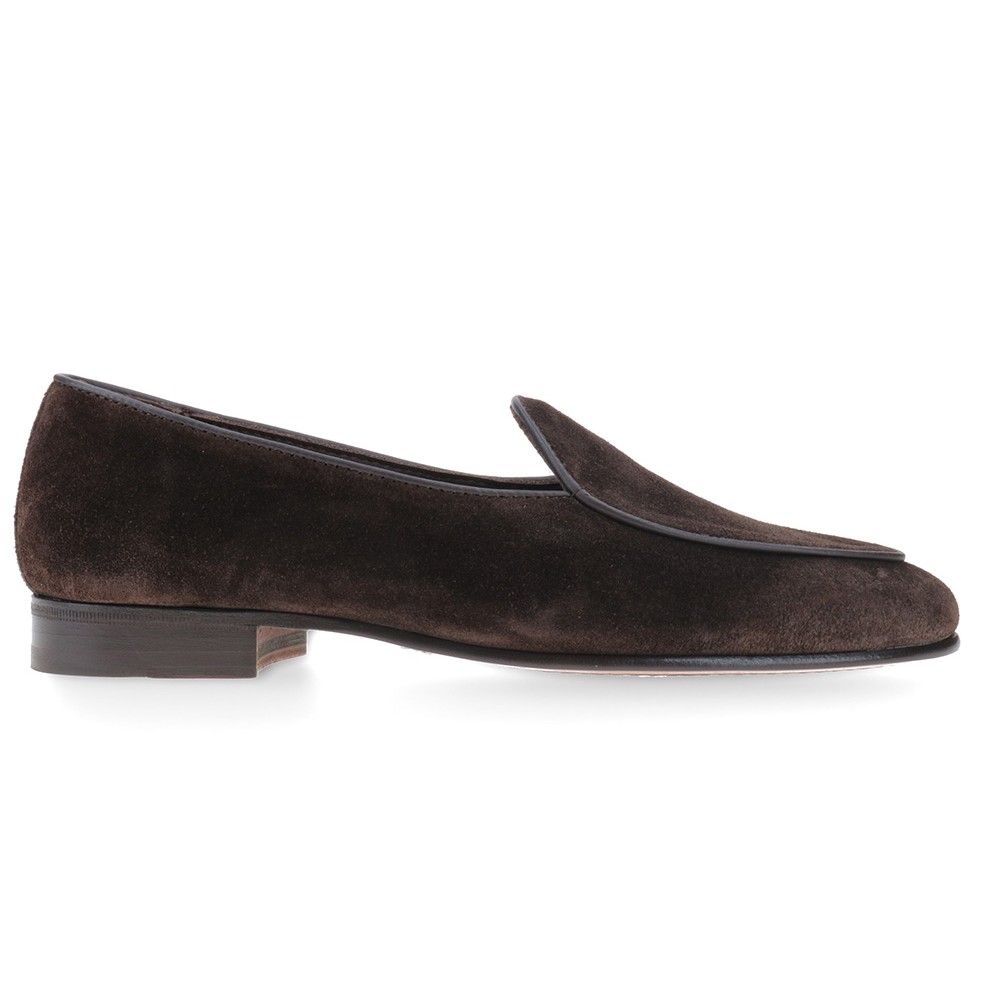 Belgischer Mokassin aus italienisch gegerbtem Wildleder, minimal gefüttert für mehr Frische und mit einer gemischten Sohle/Gummisohle, die der Eleganz der Sohle den rutschfesten Halt des Gummis hinzufügt.