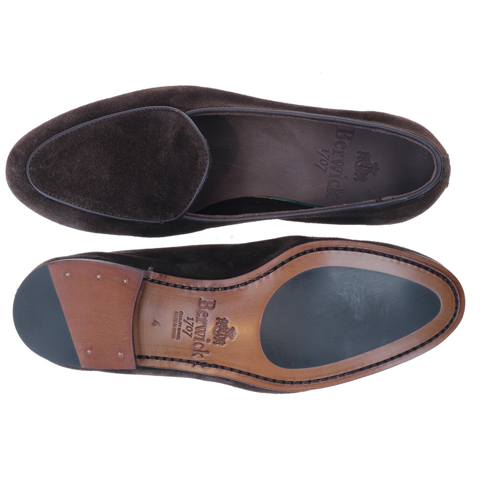 Minimal gefütterter belgischer Mokassin aus Wildleder und gemischter Sohle und Gummi.