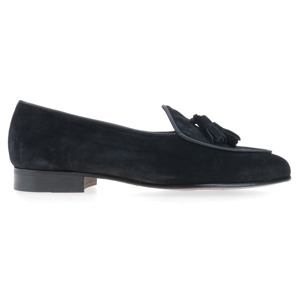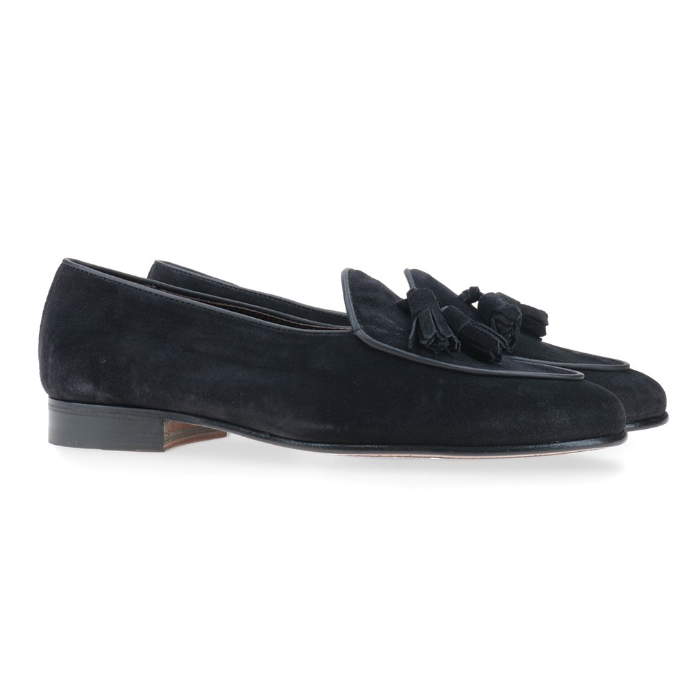 Mocasín belga con borlas, mínimamente forrado, fabricado en ante y piso mixto de suela y goma.