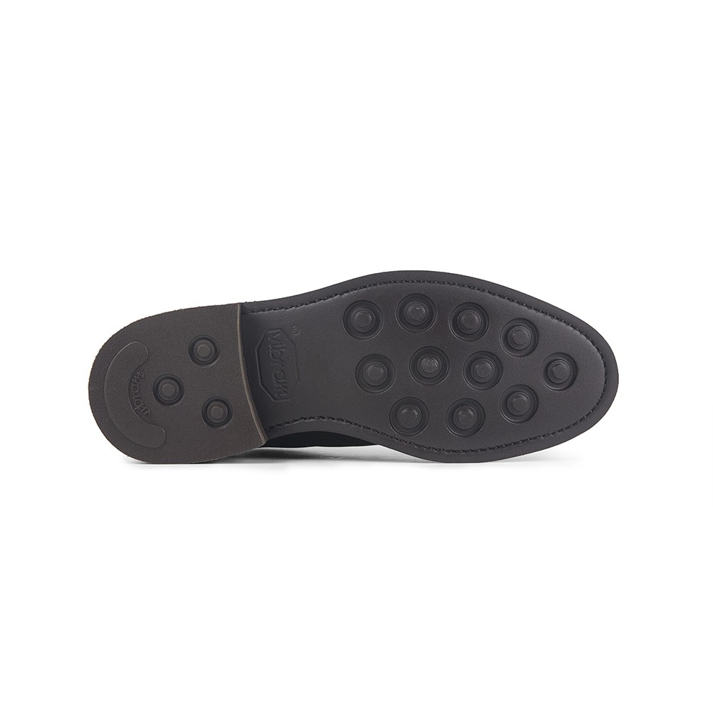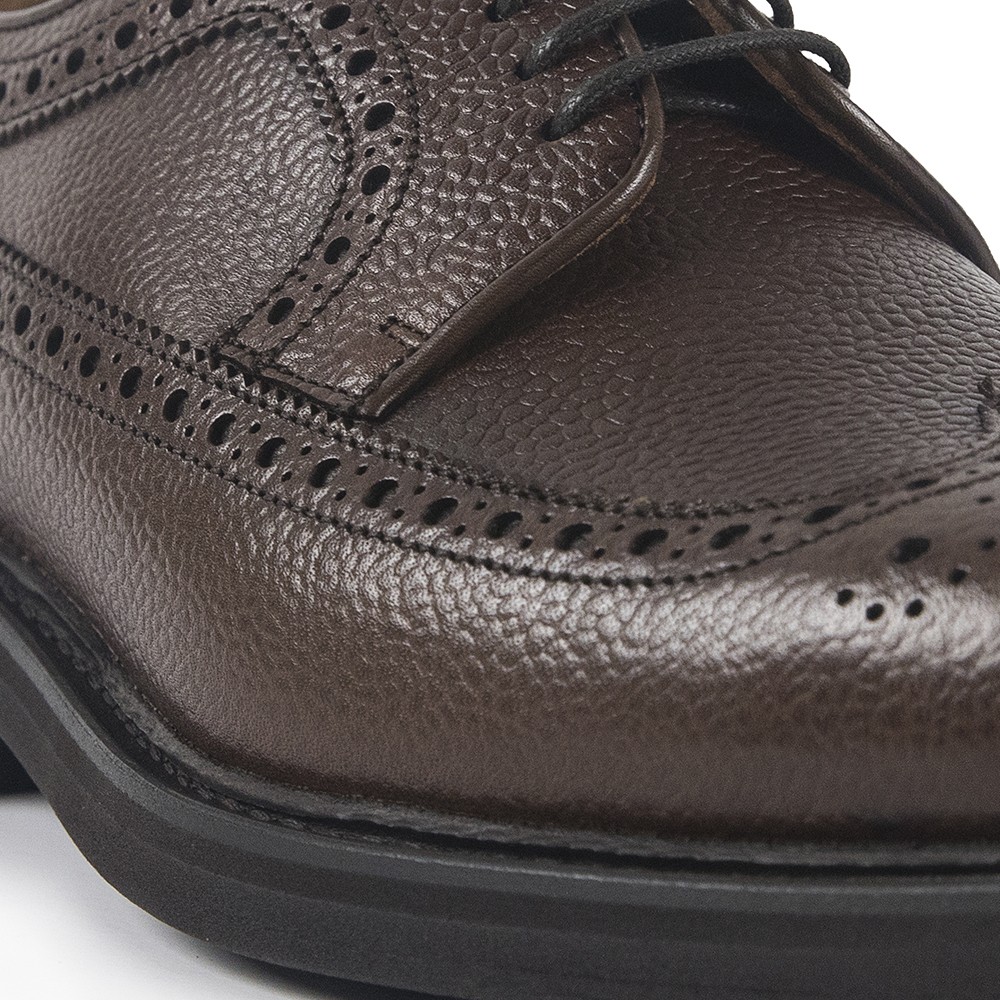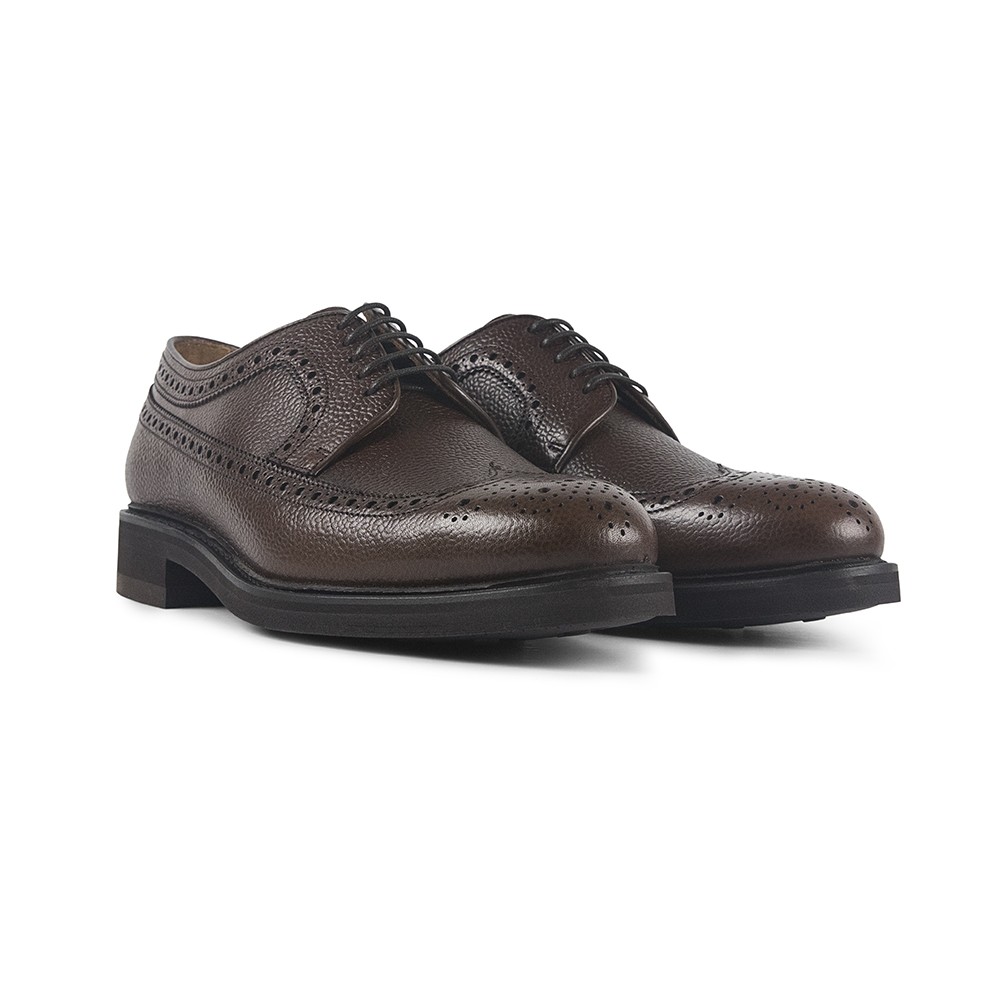 Zapato tipo Blúcher o Derby con puntera vega o wingtip, festón y trepados realizado en piel vacuna graneada y piso blando y ligero de Vibram, con entresuela y cerco de cuero alto para mejor protección contra la lluvia y humedad. Unos zapatos para cualquier estilo de vestir.