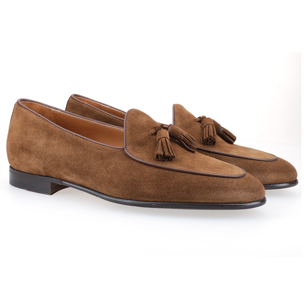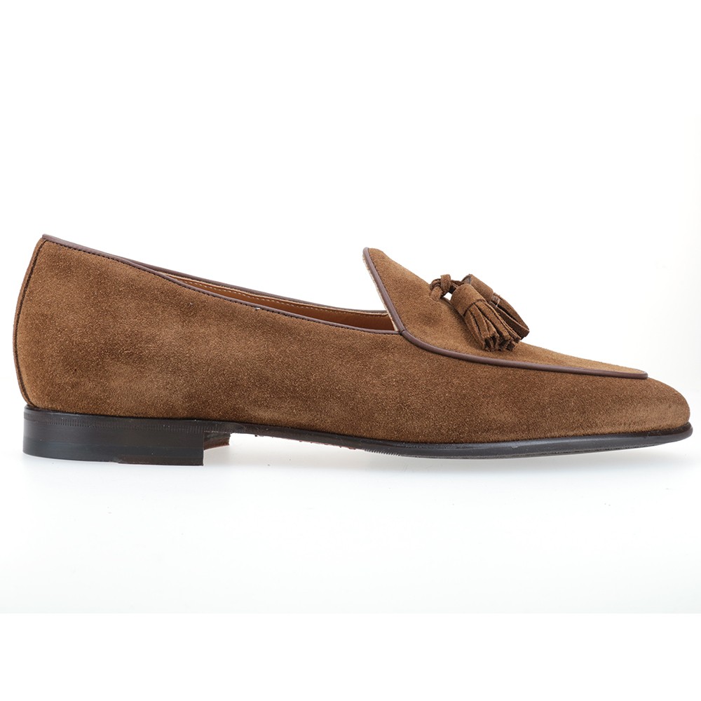 Mocasín belga fabricado en ante engrasado inglés y piso combinado de suela y spay de goma, lo que le aporta más aislamiento del suelo y durabilidad.