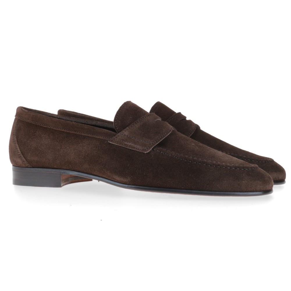 Mocassin à bride (penny loafer) en daim, sans doublure pour plus de fraîcheur, et semelle cousue Blake associée à une semelle extérieure en caoutchouc pour une meilleure adhérence au sol.