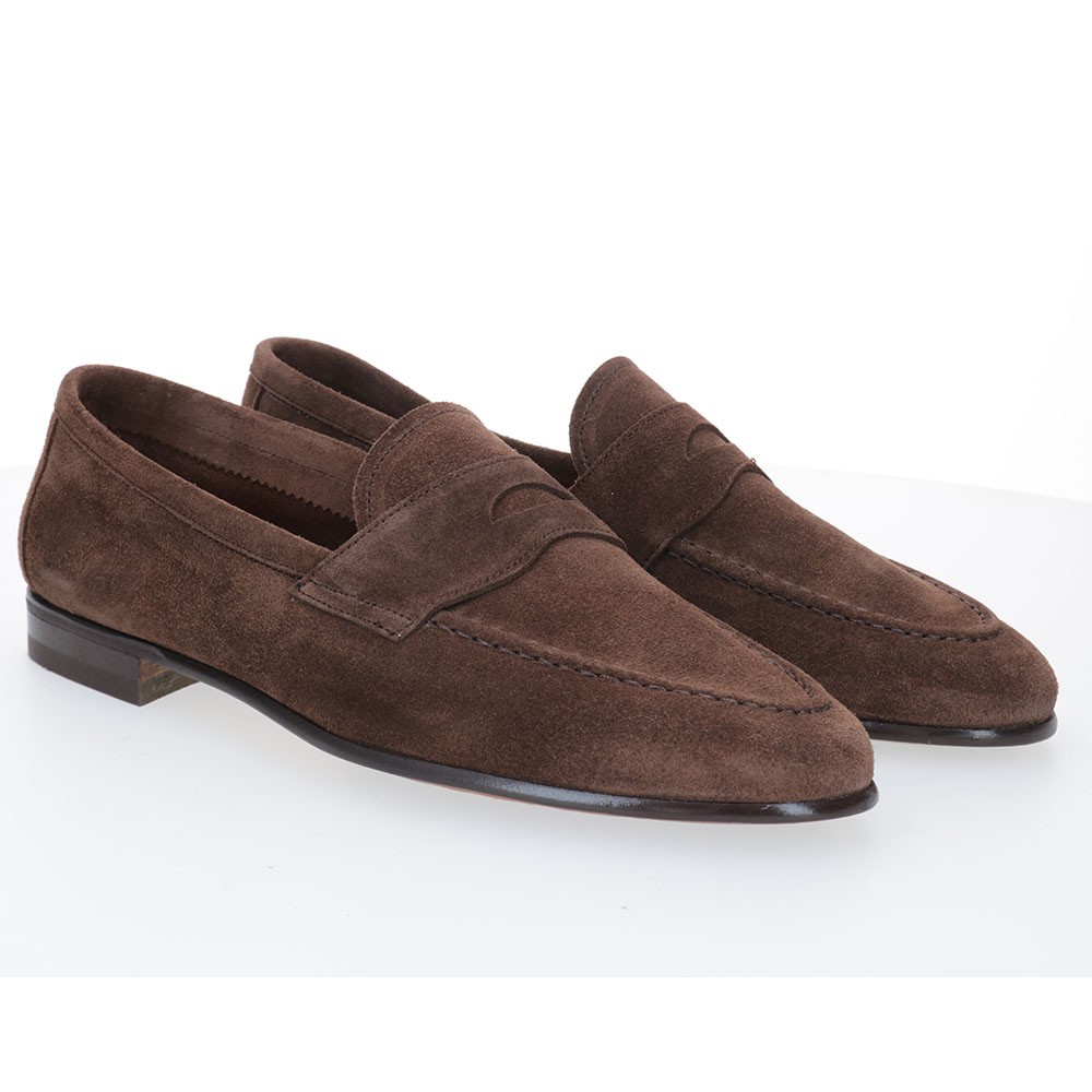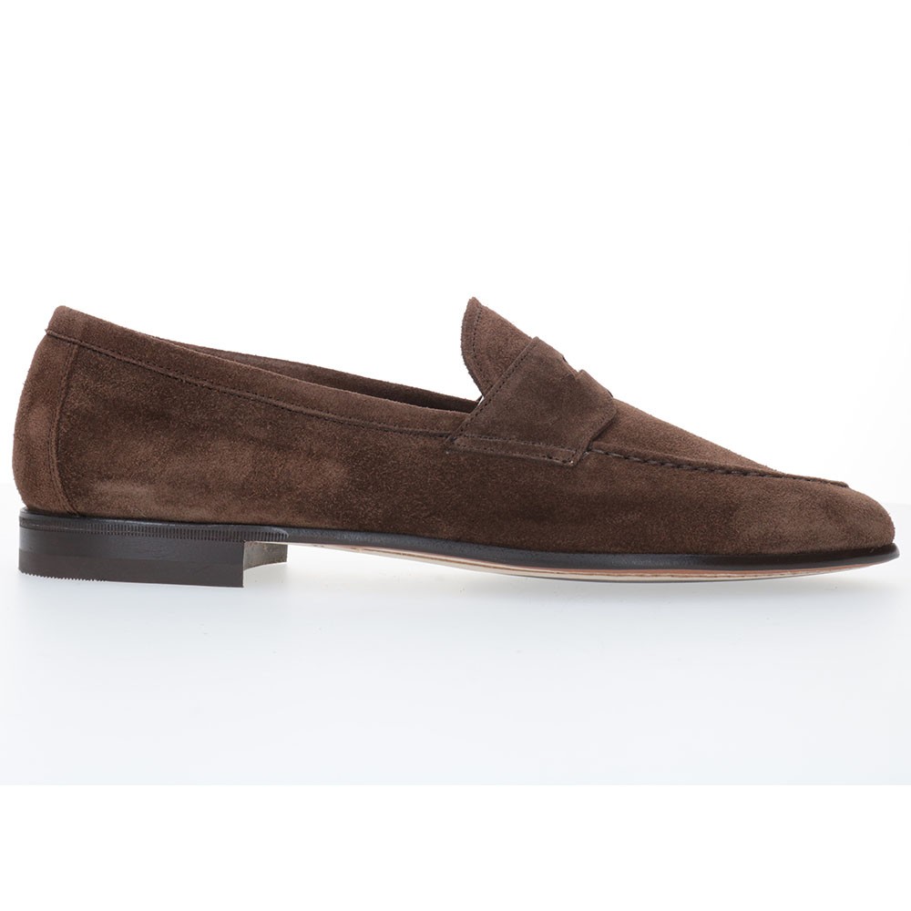 Mocassin à bride (penny loafer) en daim, sans doublure pour plus de fraîcheur, et semelle cousue Blake associée à une semelle extérieure en caoutchouc pour une meilleure adhérence au sol.