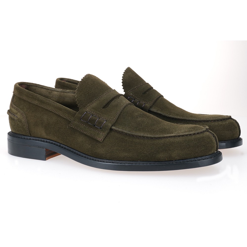 Mocassini in pelle scamosciata inglese e suola in cuoio, con finiture in filo cerato fatte a mano.
