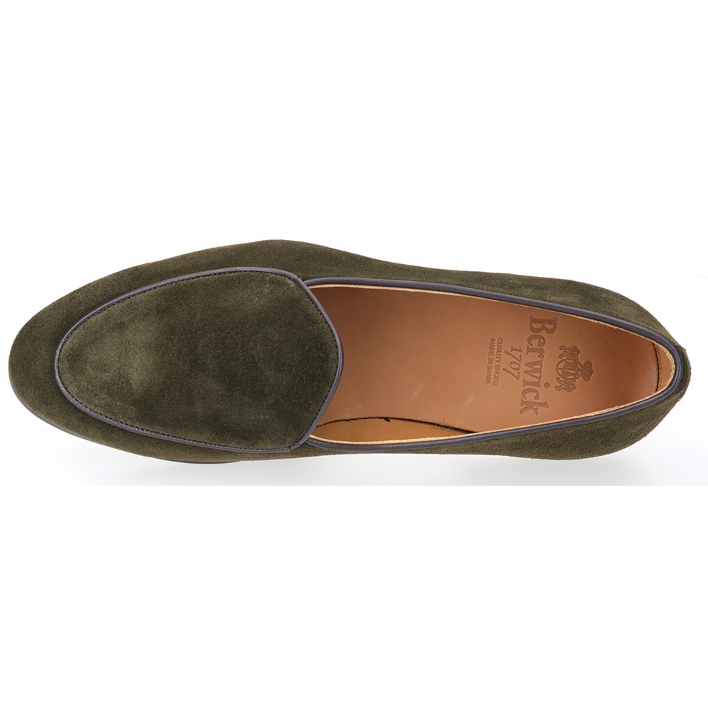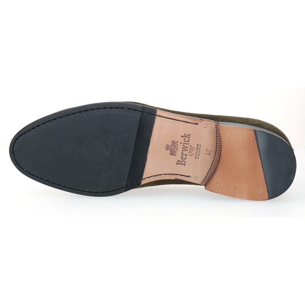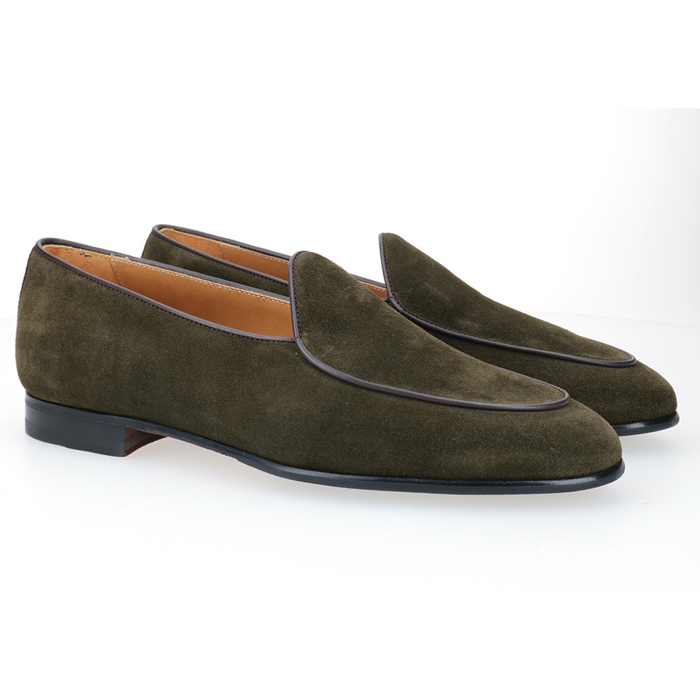 Mocassino belga in pelle scamosciata oliata e suola combinata in gomma.