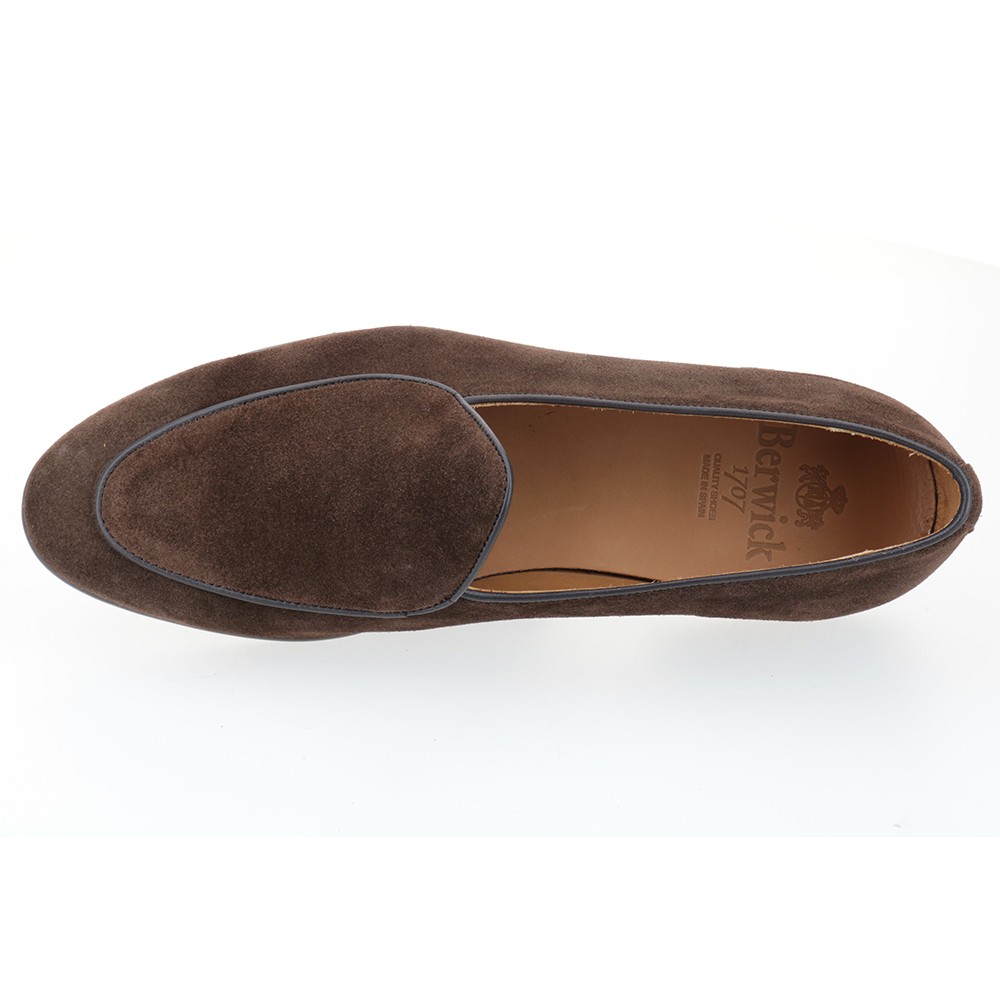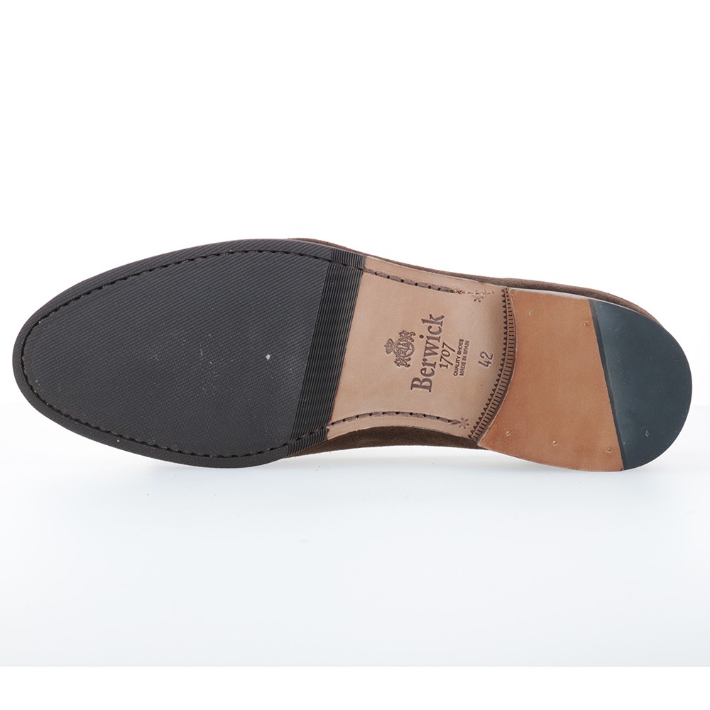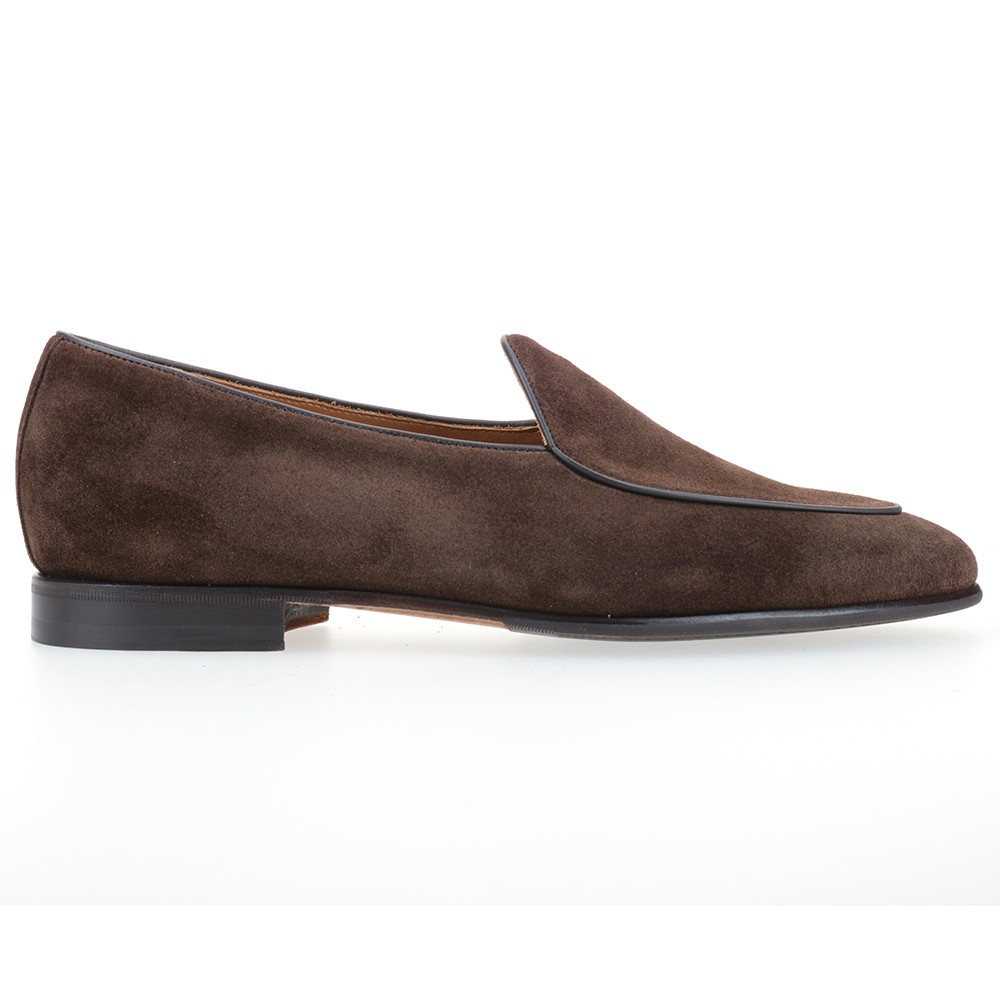 Mocassino belga in pelle scamosciata oliata e suola combinata in gomma.