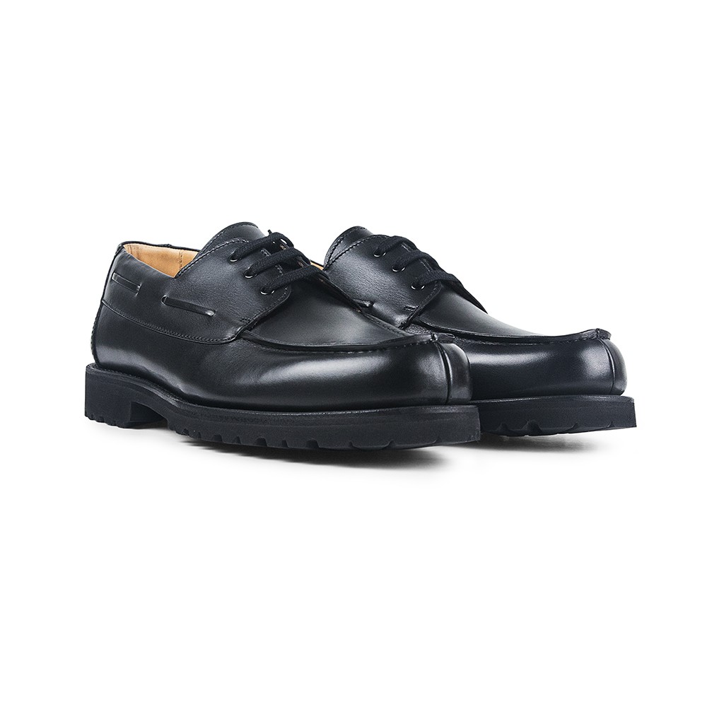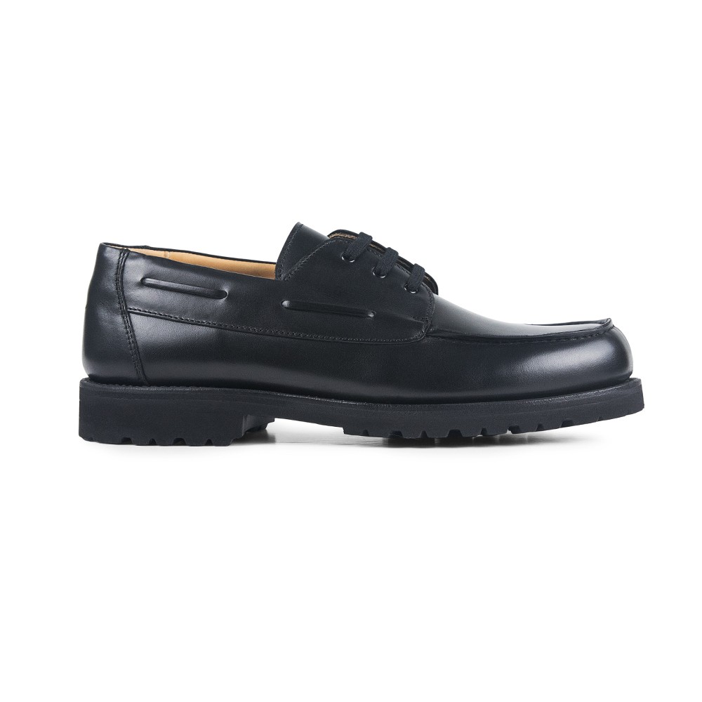 Scarpa blucher in stile nautico realizzata in morbida pelle di vitello e suola in gomma leggera e antiscivolo Vibram, con costruzione Goodyear Welt. Un modello per uno stile di abbigliamento casual adatto a quasi tutte le stagioni dell'anno.
